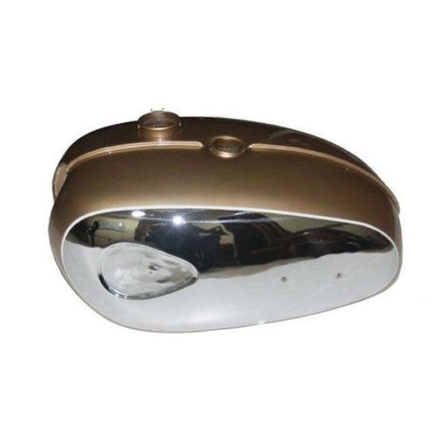 Brand new GOLDEN PAINTED with CHROME PLATED THUNDERBOLT A65 BARE METAL PETROL FUEL TANK. The above tank is made from 18 gauge steel sheet. The tank is handcrafted in India to exact dimesions of the original ones. This can be fitted on BSA THUNDERBOLT A65 1960’s MODELS. Please check the measurements shown below before buying this fuel tank. We do have chrome plated tanks and mudguards for your vintage bikes.
